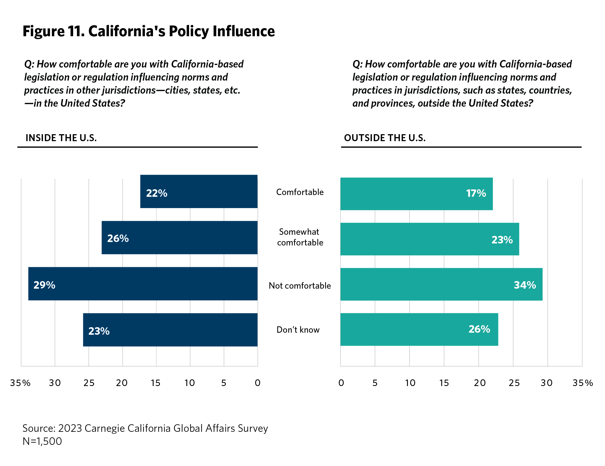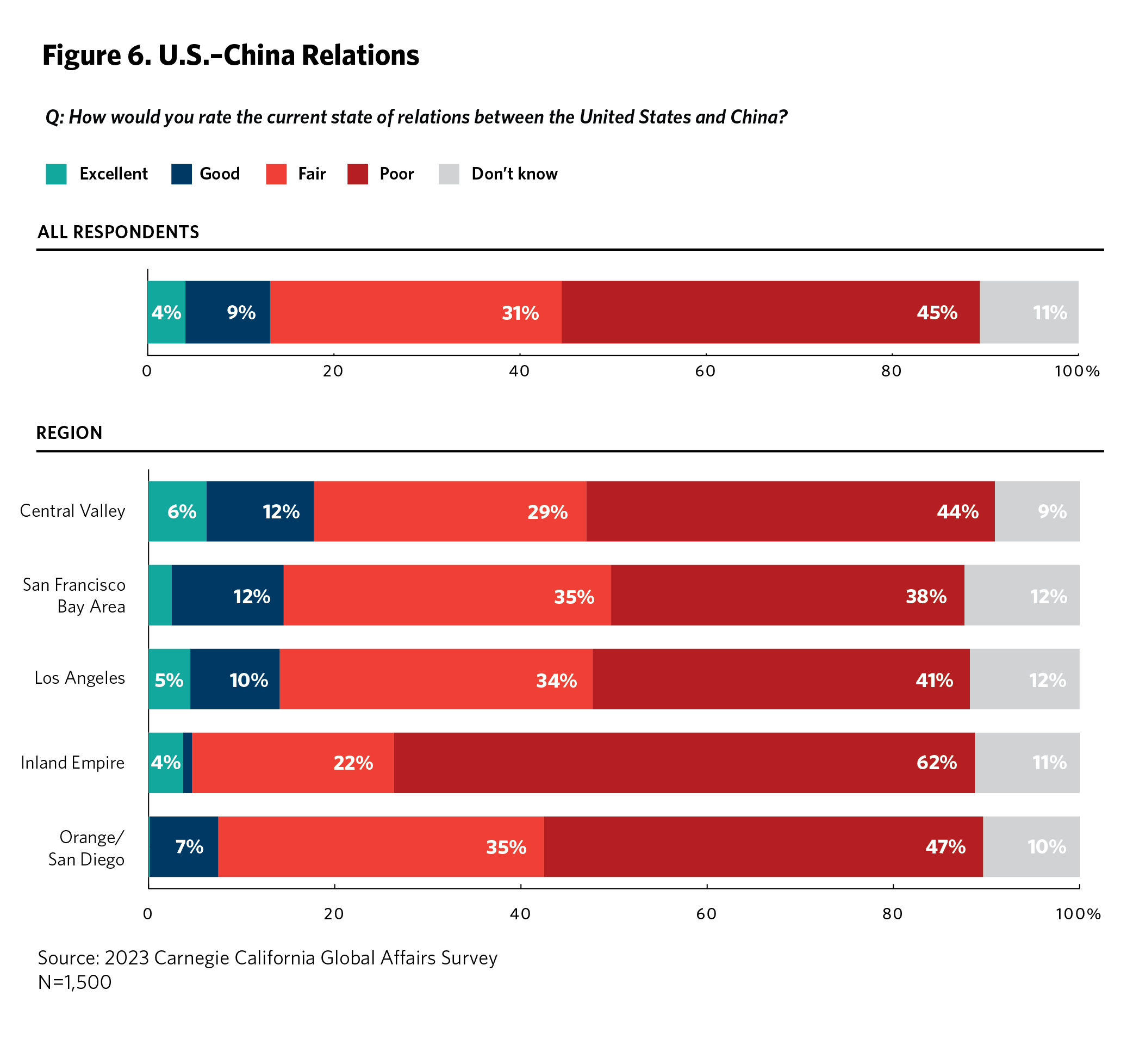 This is the first year of the Carnegie California Global Affairs Survey. Findings in this paper are based on a survey of 1,500 adult California residents. The survey was conducted via YouGov between July 20 and August 15, 2023, in English and Spanish according to respondents’ preferences. The questions in four topic areas were designed by the Carnegie California survey team. The Carnegie California survey team invited input, comments, and suggestions from policy experts and its own advisory group—including advisers from state and local government, California universities and think tanks, and civil society—during two workshops in early June 2023, but survey methods, questions, and content were solely determined by the Carnegie California survey team.
