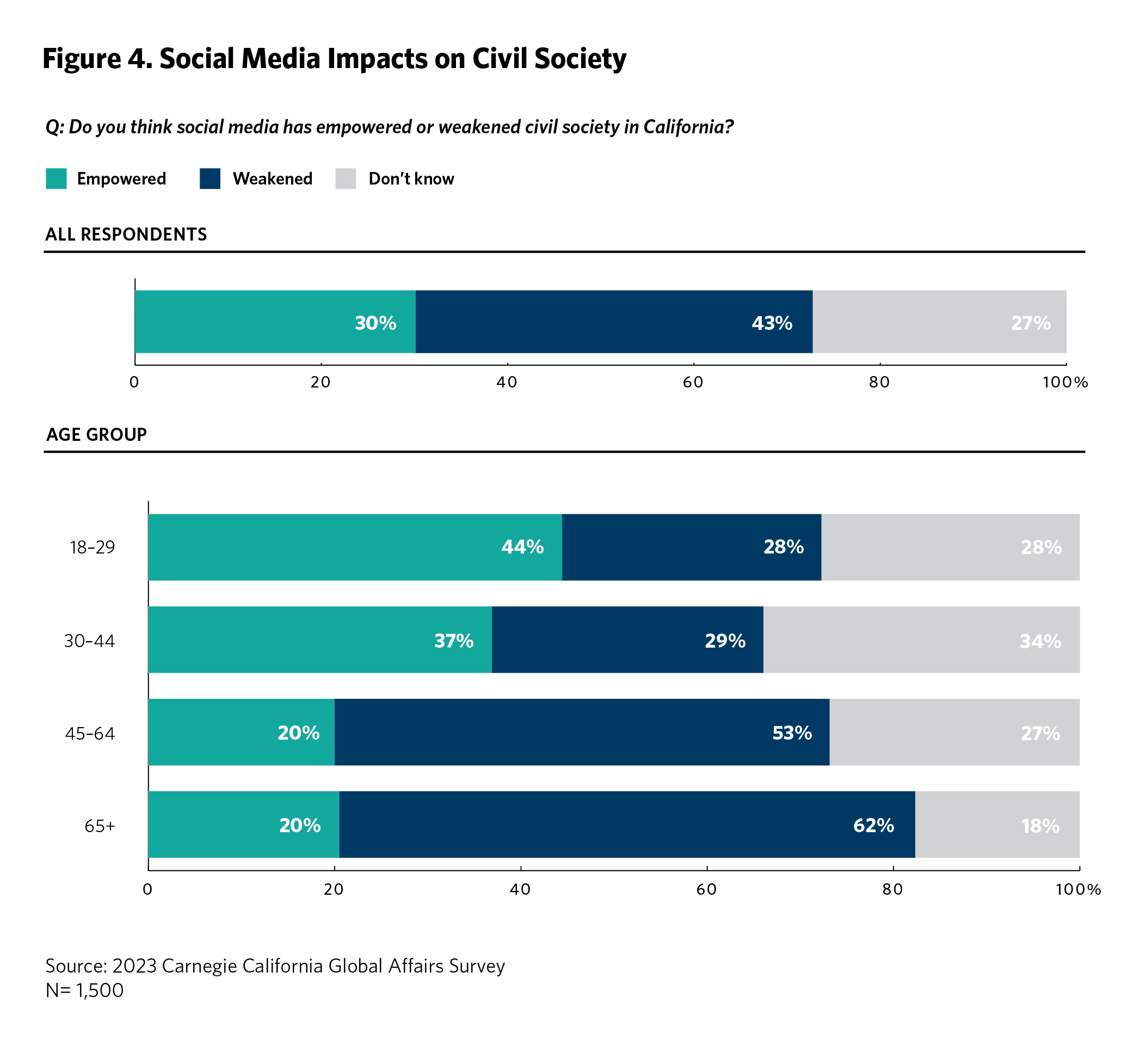 Forty-three percent believe that social media has weakened civil society in California (30 percent say that it has strengthened civil society and 27 percent are unsure). Central Valley, Inland Empire, Los Angeles, Orange/San Diego, and San Francisco Bay Area residents are more likely to say that social media has weakened rather than strengthened civil society. As captured in figure 4, older adults and White respondents are most likely to say it has weakened civil society, Californians are more divided about social media’s impact on democracy globally (26 percent say social media is overall a good thing, 28 percent say it is a bad thing, and 34 percent are neutral) and in the United States (26 percent say social media is a good thing, 32 percent say it is bad, and 31 percent are neutral).