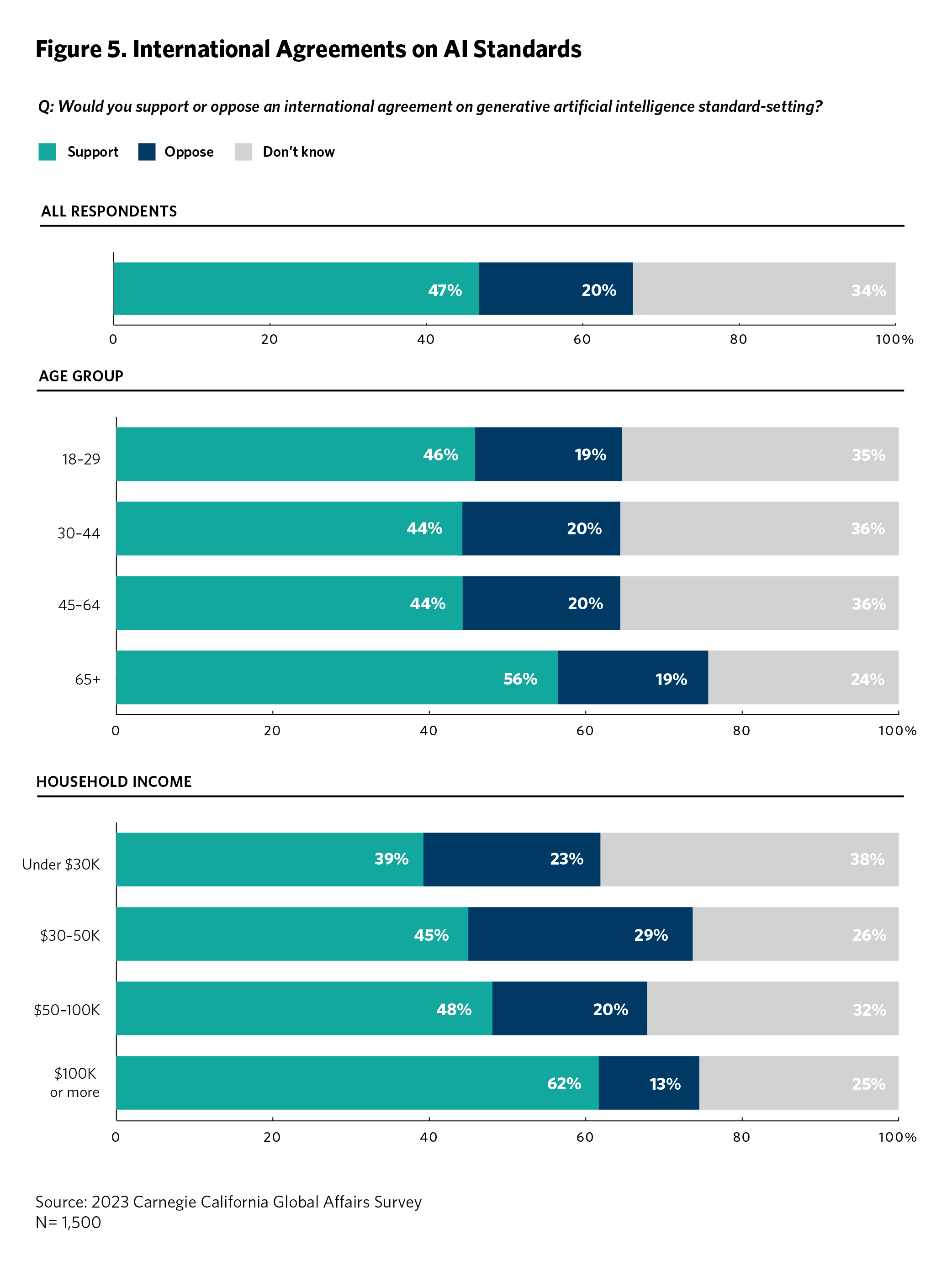 Forty-seven percent of Californians support an international agreement on AI standard setting; 20 percent oppose it, and 34 percent do not know. (see figure 5) Public support for an international agreement on AI increases with age and income. It also varies across parties (with 63 percent support among Democrats, 37 percent among Republicans, and 46 percent among independents) and increases with higher education.