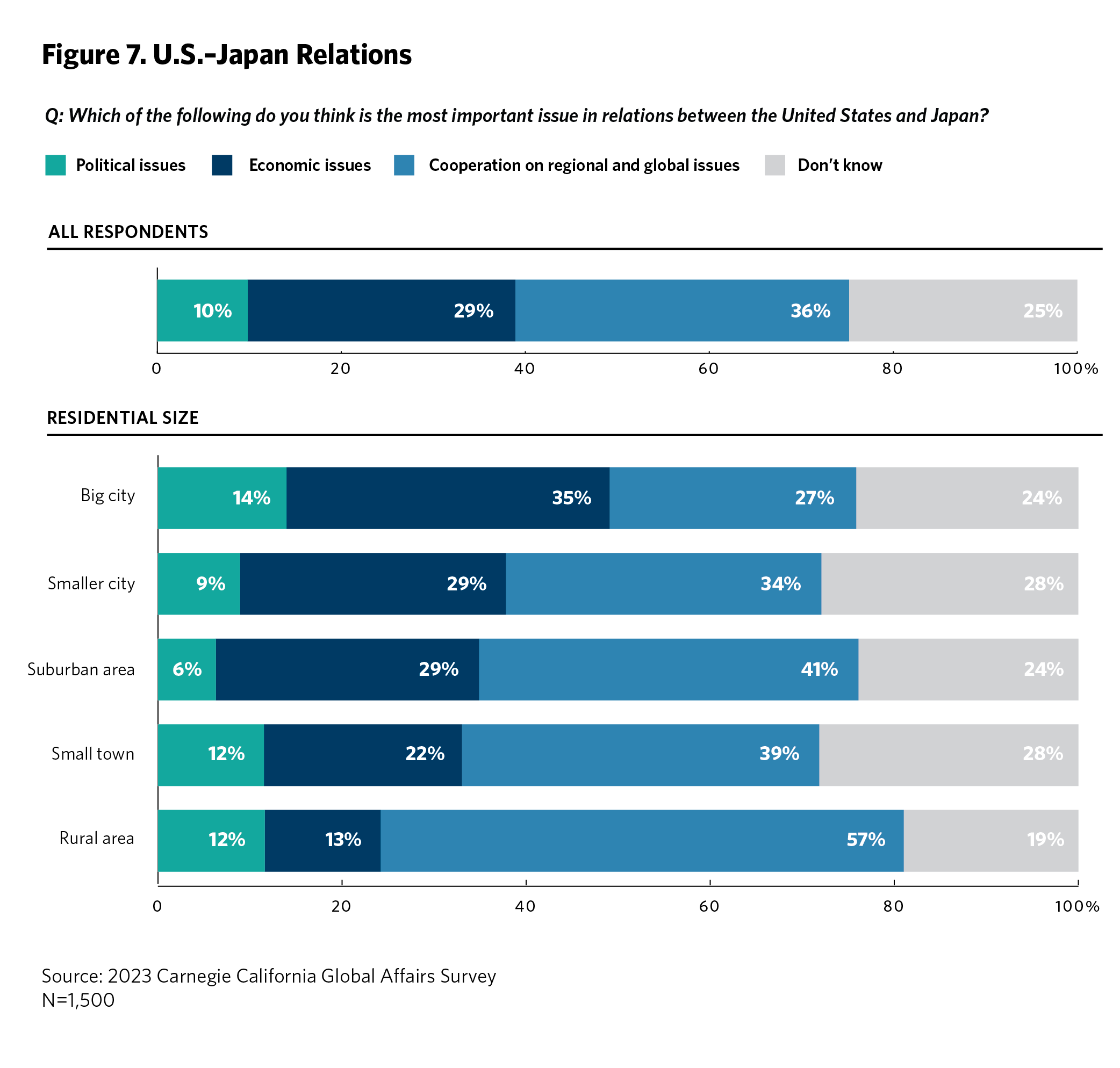 U.S. bilateral diplomatic relationships, while different in each discrete case, are at the moment notably strong with India, Japan, and South Korea. Indian Prime Minister Narendra Modi’s June state visit to the United States, as well as the Trilateral Leaders’ Summit at Camp David in August between Japan, South Korea, and the United States, demonstrate the importance of Indo-Pacific and East Asian diplomacy to the United States. For Californians watching the region and trans-Pacific diplomacy, cooperation on regional and global issues is the most important issue in relations between the United States and India (33 percent), Japan (36 percent), and South Korea (33 percent). Respondents also highlight economic issues, particularly when it comes to relations with India (29 percent) and Japan (29 percent). Republicans and those from Los Angeles are more concerned with economic issues regarding the relationship with Japan. Respondents above the age of sixty-five years and those living in small cities or towns, suburbia, or rural areas are more concerned with regional cooperation with Japan (see figure 7).