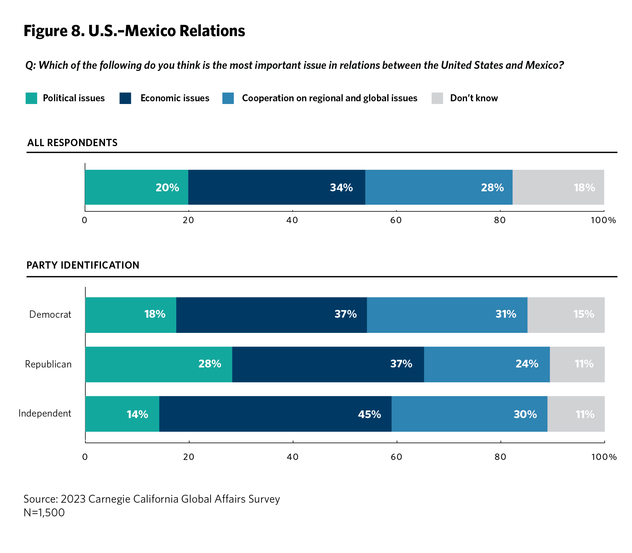For relations with Mexico, high-earning respondents are significantly more concerned with economic relations (43 percent) than cooperation on regional and global issues (30 percent). There was also a notable split between registered voters, 38 percent of whom believe economic relations to be more important than regional cooperation (considered more important by 28 percent), and nonvoters, 30 percent of whom believe regional cooperation to be more important than economic relations (considered more important by 23 percent). In contrast to their views on U.S. relationships in Latin America generally, when it comes to Mexico, figure 8 shows that independents are more concerned with economic relations (45 percent) than with cooperation on regional and global issues (30 percent).
